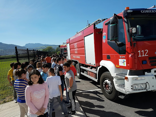 Hoy hemos tenido visita de los bomberos del 112 y nos han recordado algunas cosas que ya sabíamos y hemos aprendido otras. Alberto se subió a la grúa y David EF se vistió con el traje completo. Uffffff que calor tuvo que pasar.